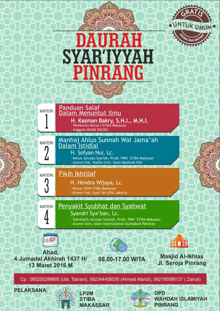 Lembaga Penelitian dan Pengabdian kepada Masyarakat (LP2M) STIBA Makassar baru-baru ini mengadakan Daurah Syar’iyah di Kota Pinrang. Daurah yang dihelat pada tanggal 4 Jumadal Akhirah 1437 H/13 Maret 2016 M ini dihadiri sekira 350 orang peserta laki-laki dan perempuan.