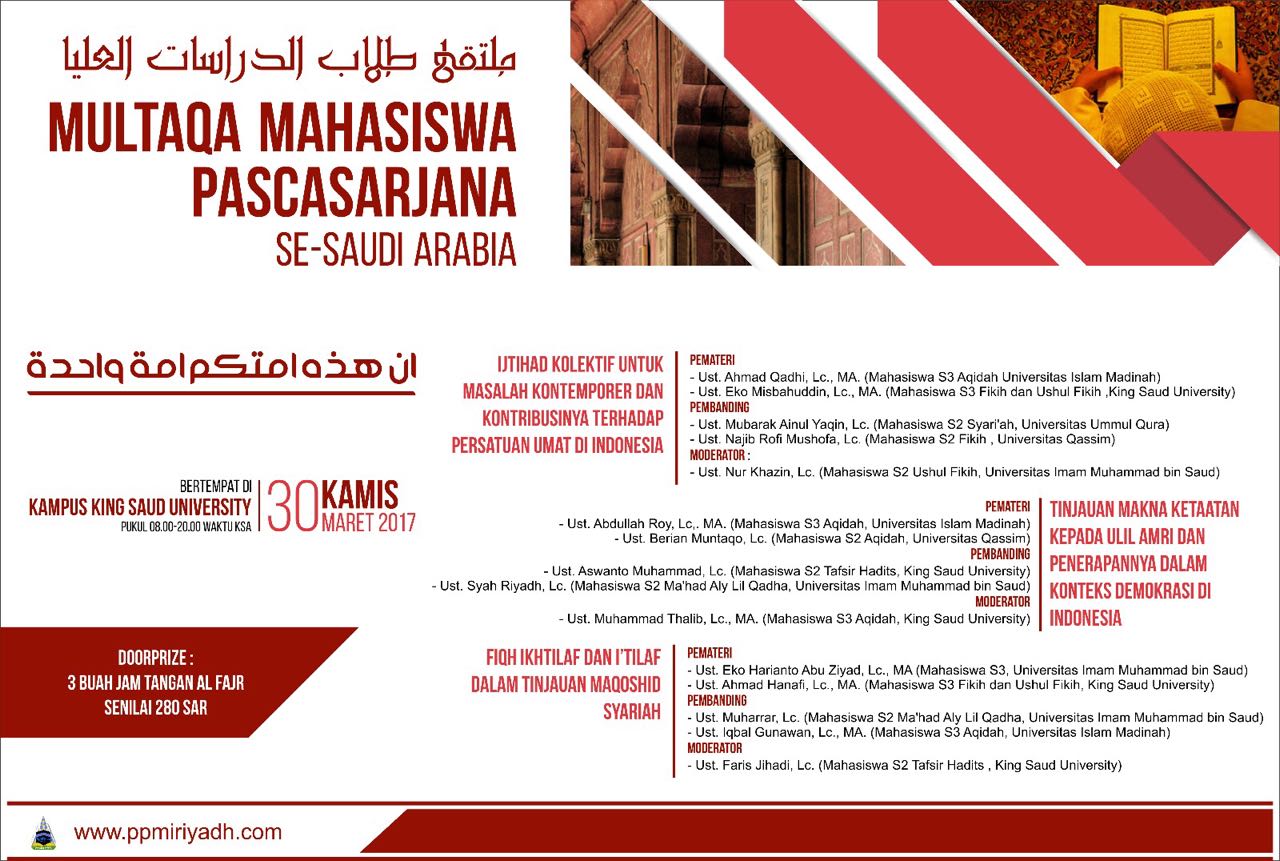 Persatuan Pelajar dan Mahasiswa Indonesia (PPMI) cabang Riyadh mengadakan multaqa bagi seluruh mahasiswa pascasarjana se-Saudi Arabia. Multaqa ini mengusung tema “Inna Hadzihi Ummatukum Ummatan Wahidah”, yang berarti “Sesungguhnya (agama tauhid) ini adalah agama kamu semua, agama yang satu”, terinspirasi dari ayat 52 dalam Surah al-Mu’minun.