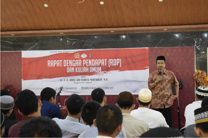 Senator asal Sulawesi Selatan, Ir. H. Abdul Aziz Kahar Muzakkar, M.Si. memberikan kuliah umum di kampus STIBA Makassar, Kamis(13/4). Kuliah Umum yang dirangkaikan dengan Rapat Dengar Pendapat (RDP) ini dihadiri oleh tak kurang dari 100 perwakilan mahasiswa STIBA.