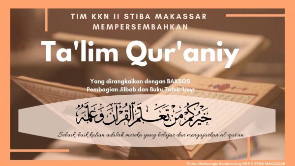 (STIBA.ac.id) Makassar –  Mahasiswi KKN II STIBA Makassar mengadakan Talim Qur’aniy di Desa Katubung Kecamatan Bantimurung, Kabupaten Maros. Tema kegiatan ini adalah خيركم من تعلم القرآن و علمه” (Sebaik-baik kalian adalah yang mempelajari Alquran dan mengajarkannya).