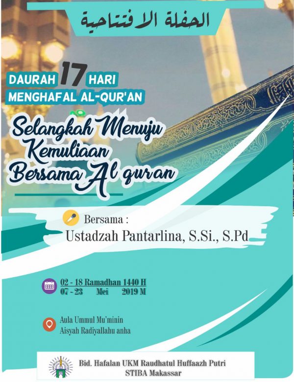 Daurah 17 Hari Menghafal Alquran terselenggara berkat prakarsa dari Bidang Hafalan UKM Raudhatul Huffaazh Putri STIBA Makassar. Kali ini, panitia pelaksana mengusung tema “Selangkah Menuju Kemuliaan Bersama Alquran”. Program ini diadakan di Kampus Putri STIBA Makassar sejak tanggal 02 Ramadhan (07/5) dan akan berakhir 18 Ramadhan 1440 H (23/5/2019 M).