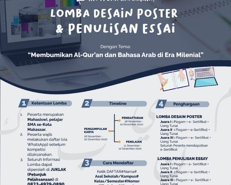 (STIBA.ac.id) Makassar – UKM Jurnalistik Putri STIBA Makassar mengadakan kegiatan Lomba Desain Poster dan Penulisan Esai dengan mengusung tema “Membumikan Al-Qur’an dan Bahasa Arab di Era Generasi Milenial”. Kegiatan ini diikuti oleh pelajar muslimah setingkat SMA se-Kota Makassar.
