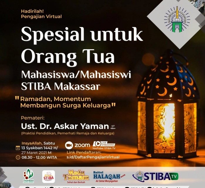 Pengajian virtual yang dikhususkan untuk para orang tua mahasiswa STIBA Makassar ini dibawakan oleh Ustaz Dr. Askar Yaman. Materi yang dibawakan oleh beliau mencakup beberapa poin penting yaitu keutamaan bulan Ramadan; Keutamaan Puasa; Bagaimana seorang Muslim Menyambut Ramadan; Amalan-amalan di bulan Ramadan, serta hal-hal yang melalaikan pada bulan Ramadan.