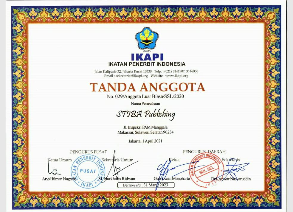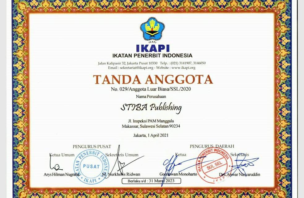 (STIBA.ac.id) Makassar – Pusat penerbitan STIBA Makassar STIBA Publishing resmi terdaftar sebagai anggota Ikatan Penerbitan Indonesia (IKAPI). Hal tersebut ditandai dengan penyerahan sertifikat tanda anggota di kantor perwakilan wilayah IKAPI Sulawesi Selatan di Jl. Borong Raya No. 75, Makasar (17 Ramadan 1442 H/29 April 2021 M).