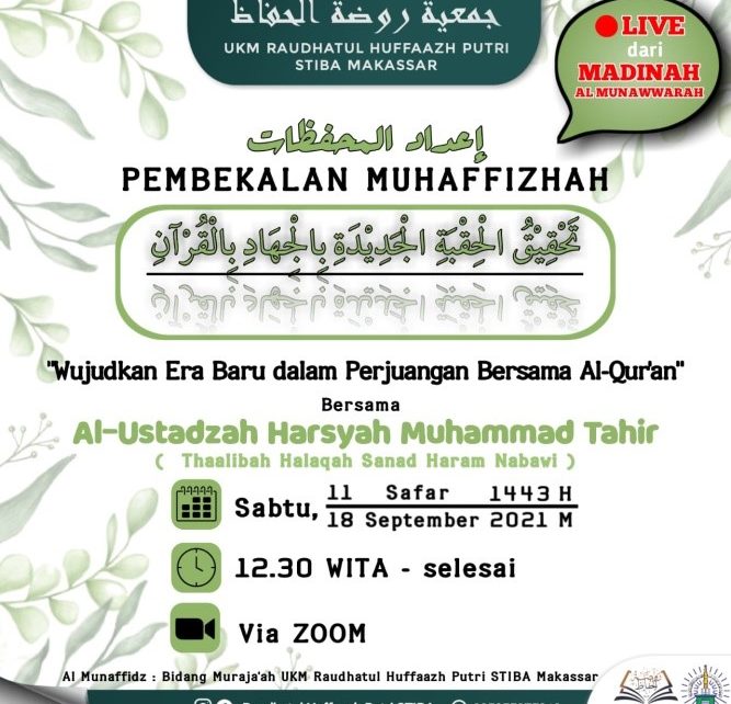 (STIBA.ac.id) Makassar – Bidang Muraja’ah UKM Raudhatul Huffaazh Putri STIBA Makassar kembali mengadakan Pembekalan Muhaffizhah pada Sabtu, 11 Safar 1443 H (18/09/2021).