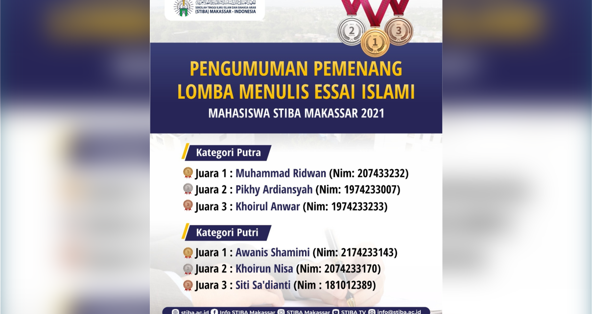 Lomba Menulis Esai tersebut diselenggarakan oleh Bagian Kegiatan Kemahasiswaan (BKK) STIBA Makassar dengan menyediakan total hadiah Rp3.600.000,- untuk enam orang pemenang baik dari mahasiswa maupun mahasiswi STIBA.