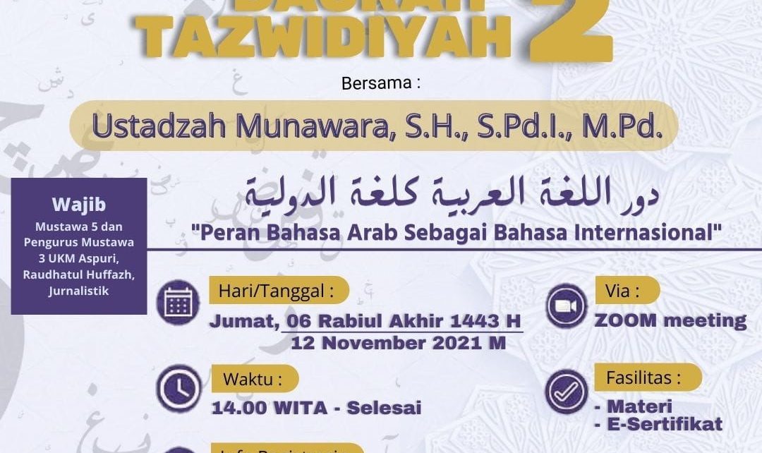 (STIBA.ac.id) Makassar –  Dalam rangka meningkatkan kualitas pengajar dan menambah wawasan sekaligus kemampuan dalam mengajar materi berbahasa Arab, Departemen Diklat Keputrian DEMA STIBA Makassar menyelenggarakan kegiatan Daurah Tazwidiyah Mu’allimah Ta’lim Lughah tahap II. Acara yang mengangkat tema “Peran Bahasa Arab sebagai Bahasa Internasional” tersebut dilaksanakan pada hari Jumat (12/11/2021).