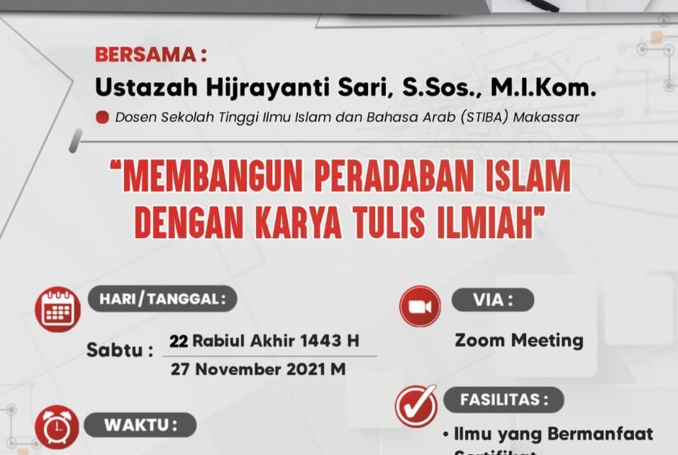 (STIBA.ac.id) Makassar –  Divisi Pengembangan Sumber Daya Manusia (PSDM) UKM Jurnalistik Putri STIBA Makassar kembali mengadakan kegiatan pelatihan kepenulisan. Kali ini, tema yang diusung adalah “Membangun Peradaban Islam dengan Karya Tulis Ilmiah.”