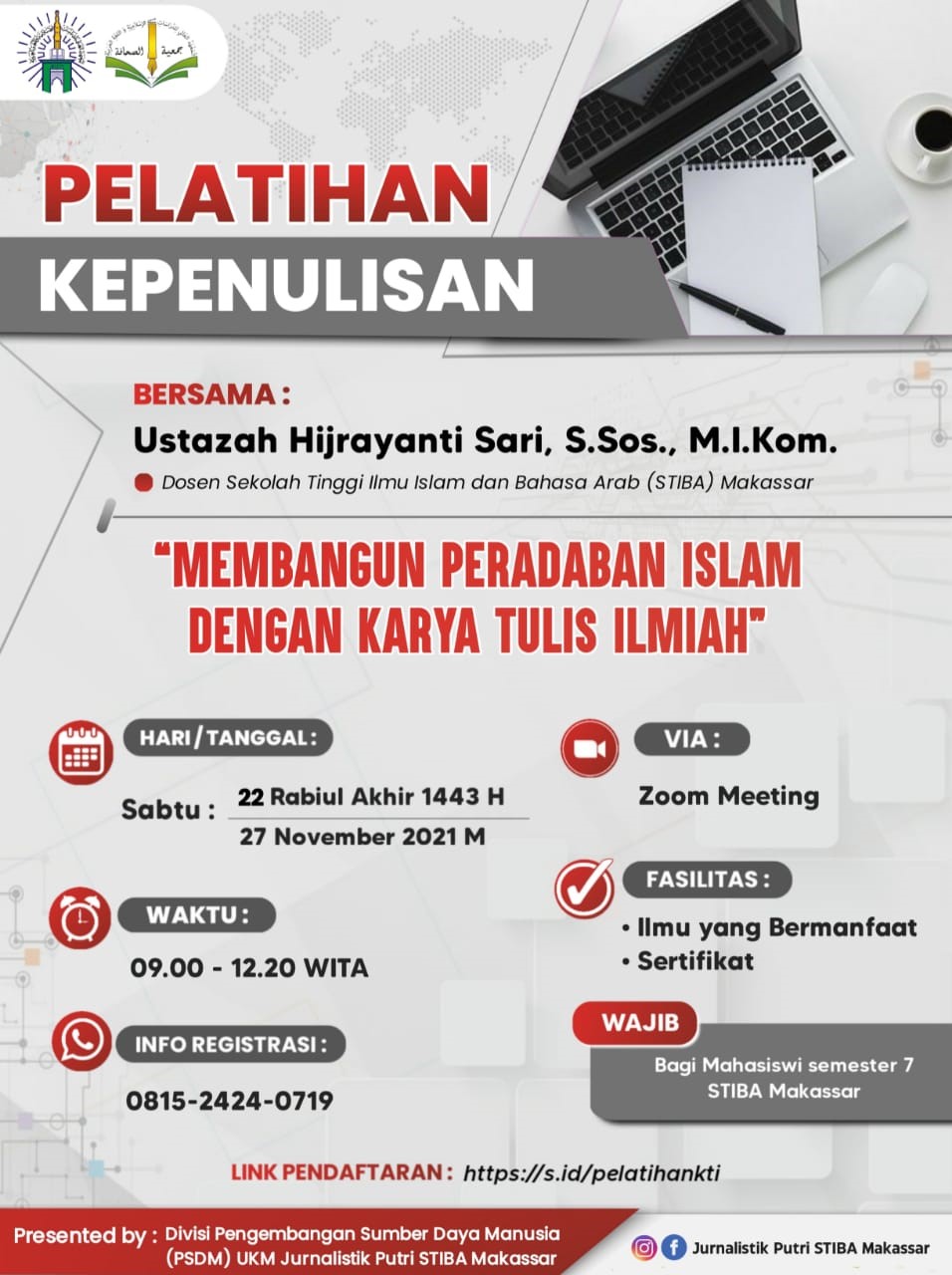 (STIBA.ac.id) Makassar –  Divisi Pengembangan Sumber Daya Manusia (PSDM) UKM Jurnalistik Putri STIBA Makassar kembali mengadakan kegiatan pelatihan kepenulisan. Kali ini, tema yang diusung adalah “Membangun Peradaban Islam dengan Karya Tulis Ilmiah.”