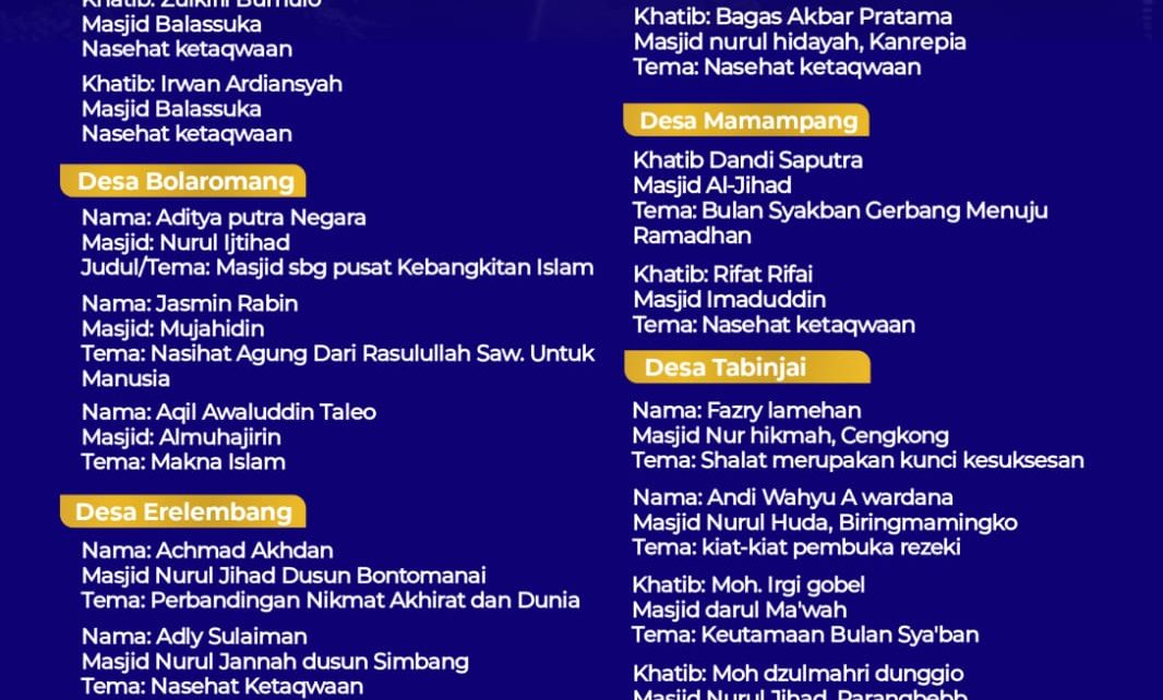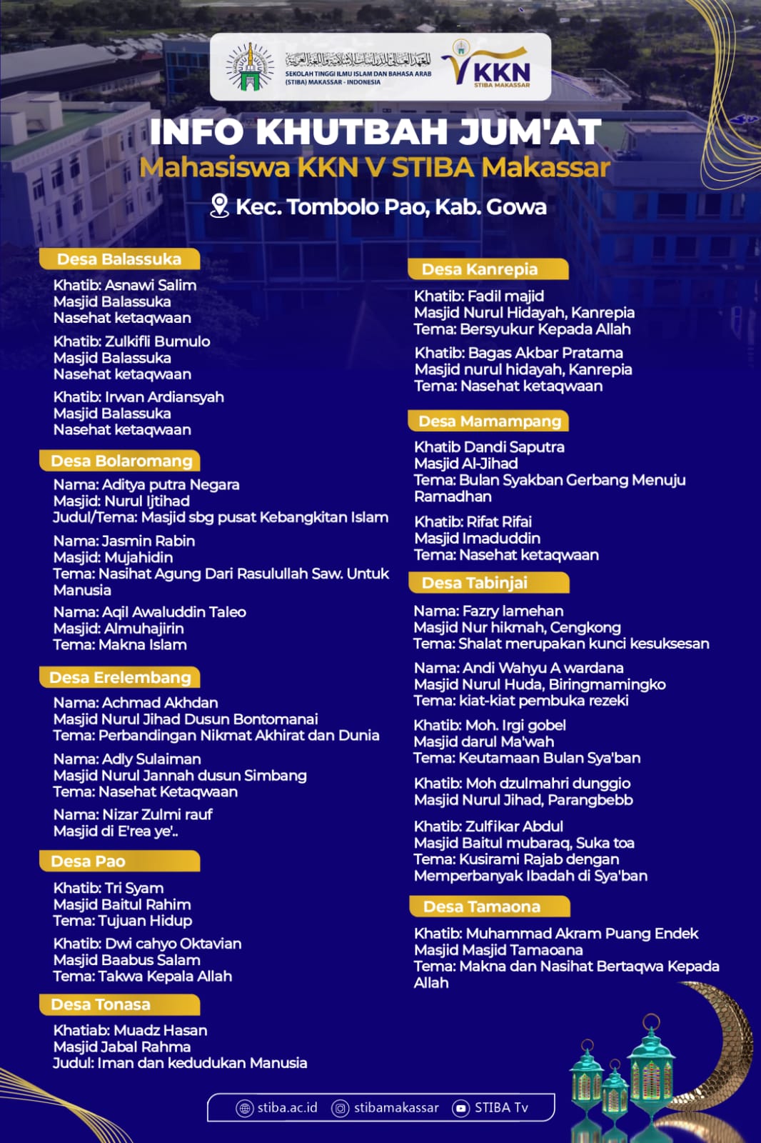 Berikut daftar 28 mahasiswa KKN STIBA Makassar yang bertugas sebagai khatib Jumat di lokasi masing-masing: