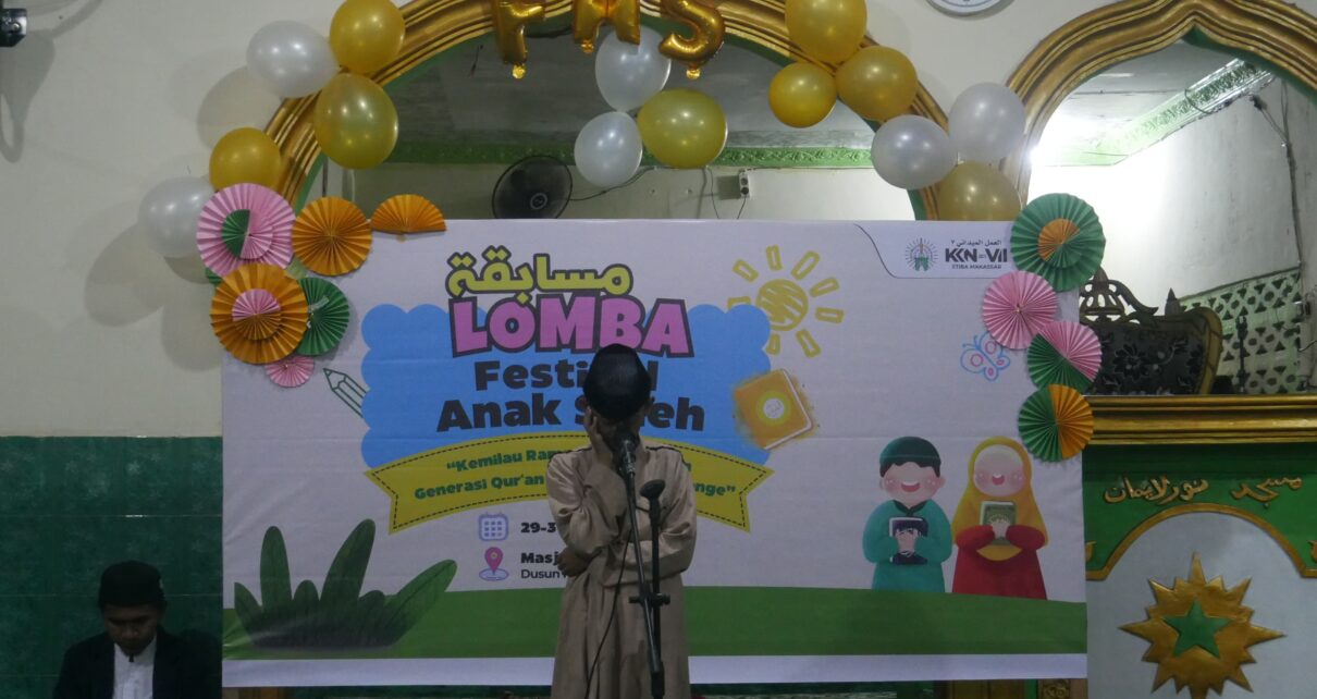 (STIBA.ac.id) Maros – Festival Anak Soleh, sebuah acara yang bertujuan untuk mewujudkan generasi Qur’an, meriah diadakan di Desa Kurusumange, dengan panggung utamanya berlokasi di Masjid Nurul Iman, Dusun Panasakkang. Acara ini diselenggarakan oleh Mahasiswa Kuliah Kerja Nyata (KKN) VII STIBA Makassar, dihadiri oleh Kepala Dusun Majannang, Pak Ramli, para santri dari 15 Taman Pendidikan Al-Qur’an (TPA), serta pimpinan TPA dan orang tua santri. Festival ini diadakan untuk menanamkan cinta terhadap Islam pada anak-anak serta memberi motivasi agar mereka terus belajar dan mendalami Al-Qur’an.