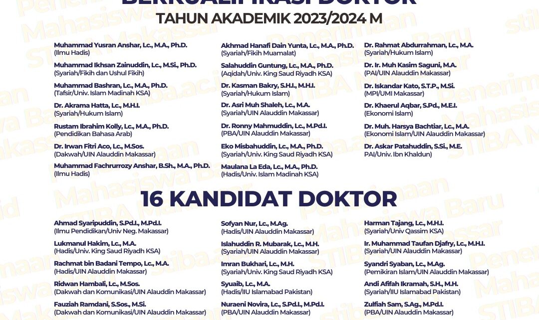 (STIBA.ac.id) Makassar – Dalam upaya meningkatkan kualitas pendidikan dan pengembangan akademik, Sekolah Tinggi Ilmu Islam dan Bahasa Arab (STIBA) Makassar melibatkan 20 dosen bergelar doktor untuk mengawal empat program studi (prodi) yang ada saat ini.