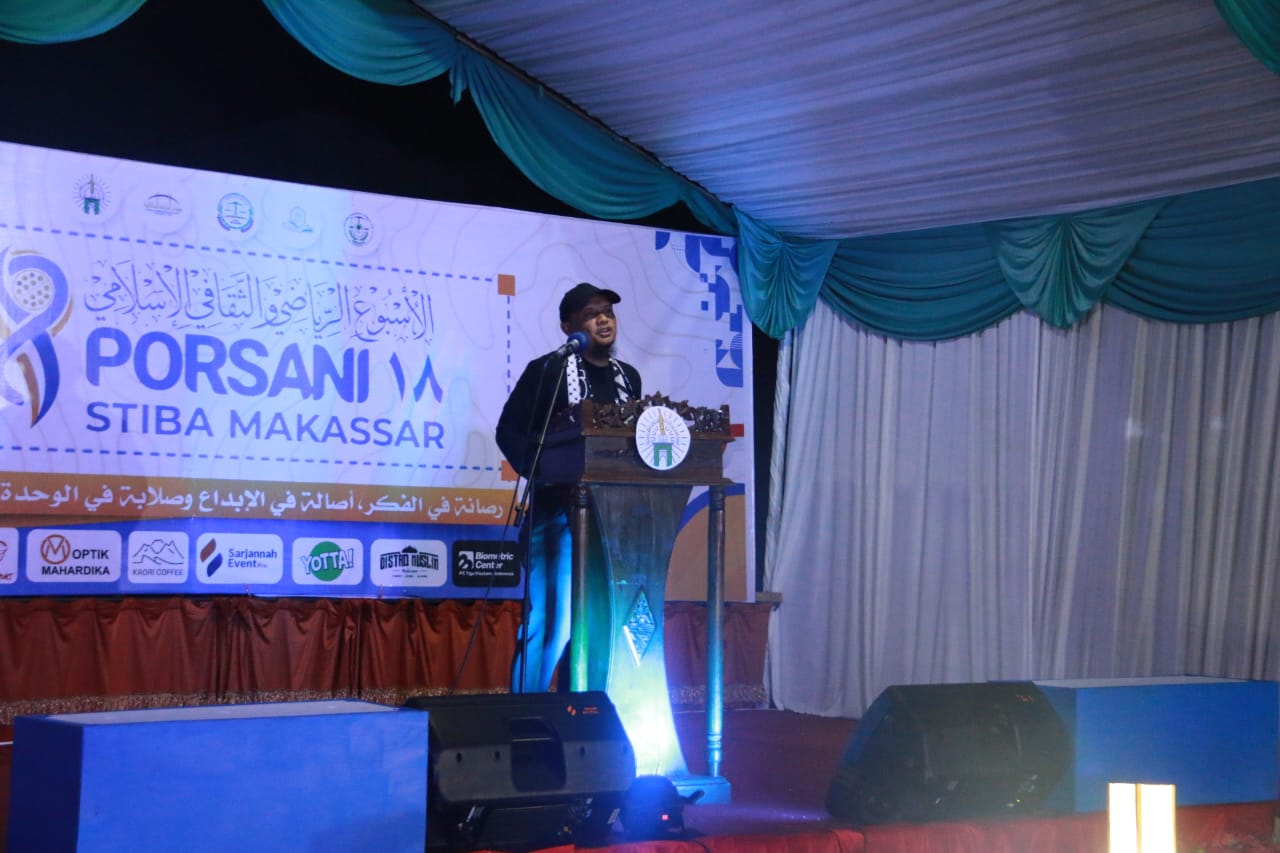 (STIBA.ac.id) Makassar — Suasana Porsani XVIII makin seru. Tapi ada satu momen yang membuat adem: sambutan dari Ketua STIBA Makassar, Ustaz Dr. Ahmad Hanafi, Lc., M.A. Beliau hadir dengan gaya khasnya yang tenang tapi mengena audiens.