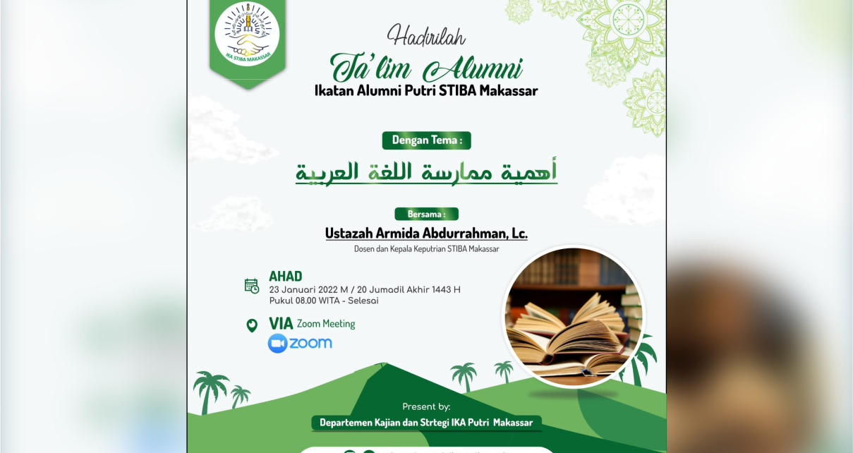 (STIBA.ac.id) Makassar – Taklim Alumni adalah sebuah inisiatif dari Departemen Kajian dan Strategi (Kastra) IKA Putri STIBA Makassar, menjadi wadah silaturahim bagi para alumni STIBA Makassar. Sesi ke-2 Taklim Alumni yang berlangsung pada Ahad, 11 Februari 2024, menghadirkan Ustazah Kurnaemi Anita, S.T., S.H., M.E. sebagai narasumber, dengan penyelenggaraan secara daring melalui zoom meeting. Kegiatan ini […]