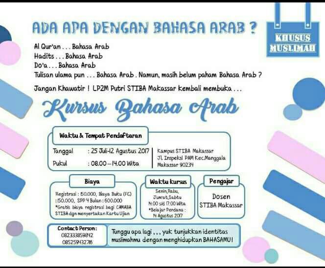 ? ? *SUKSESKAN RIHLAH TARBAWIYAH* ?? Kepada Yth *Para Donatur _hafidzakumullah_* Kembali kami mengajak para pembaca untuk berkontribusi dalam menyukseskan Rihlah Tarbawiyah Sivitas Akademika STIBA Makassar, insyaAllah pada: ? Hari/tgl: *Sabtu-Ahad, 28-29 Rajab 1439H / 14-15 April 2018M* ? Tempat: *Hutan Pendidikan UNHAS, Bengo-bengo Maros* *NB:* *Donasi bisa dalam bentuk dana, peminjaman kendaraan, makanan/minuman […]